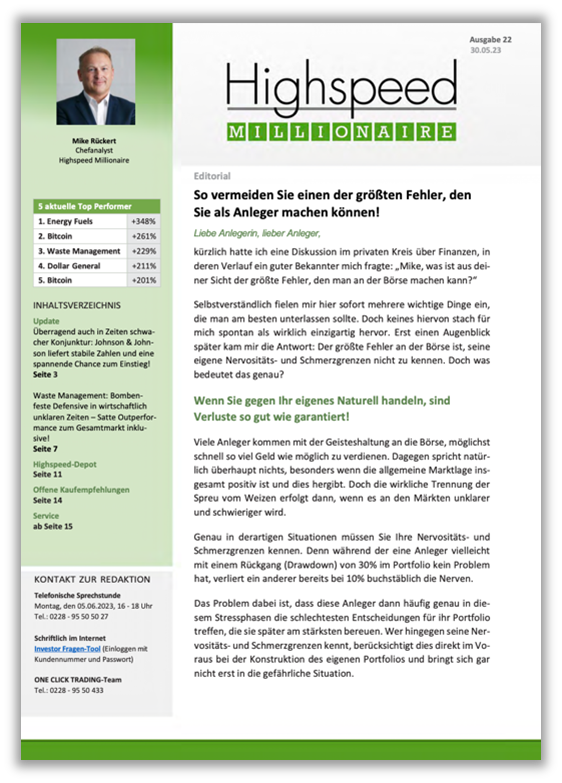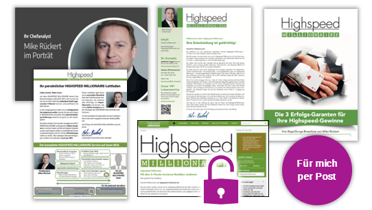 Und nebenbei erfahren Sie im Highspeed Millionaire auch noch eine Menge über erfolgreiches Investieren. Denn Mike Rückert liefert Ihnen eine Menge Hintergrundinformationen zu seinen Empfehlungen.